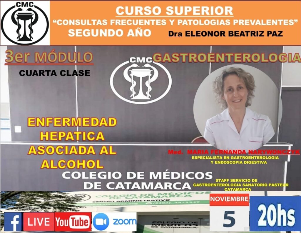Invitamos a la continuación del 2do año del Curso Superior del Colegio de Médicos de Catamarca“Consultas Frecuentes y Patologías Prevalentes” Dra. Eleonor Beatriz Paz. Seguiremos con el SEGUNDO Módulo de Gastroenterología y su CUARTA CLASE. El Viernes 05 de Noviembre a las 20 horas abordaremos la clase deENFERMEDAD HEPÁTICA ASOCIADA AL ALCOHOL a cargo de […]