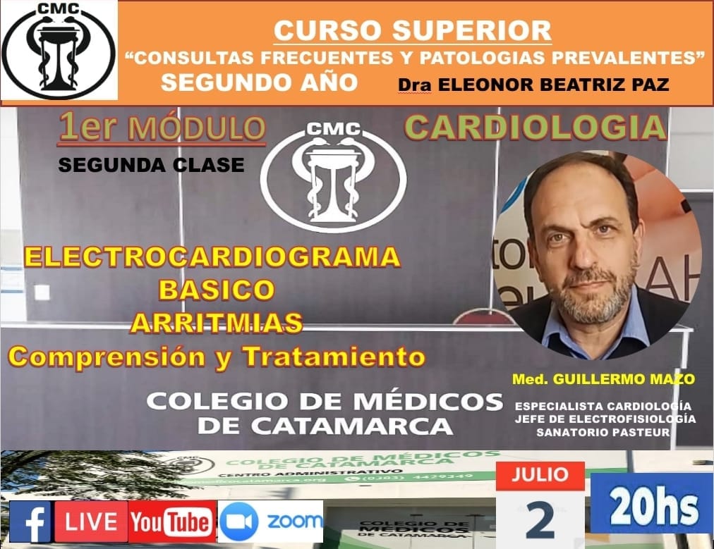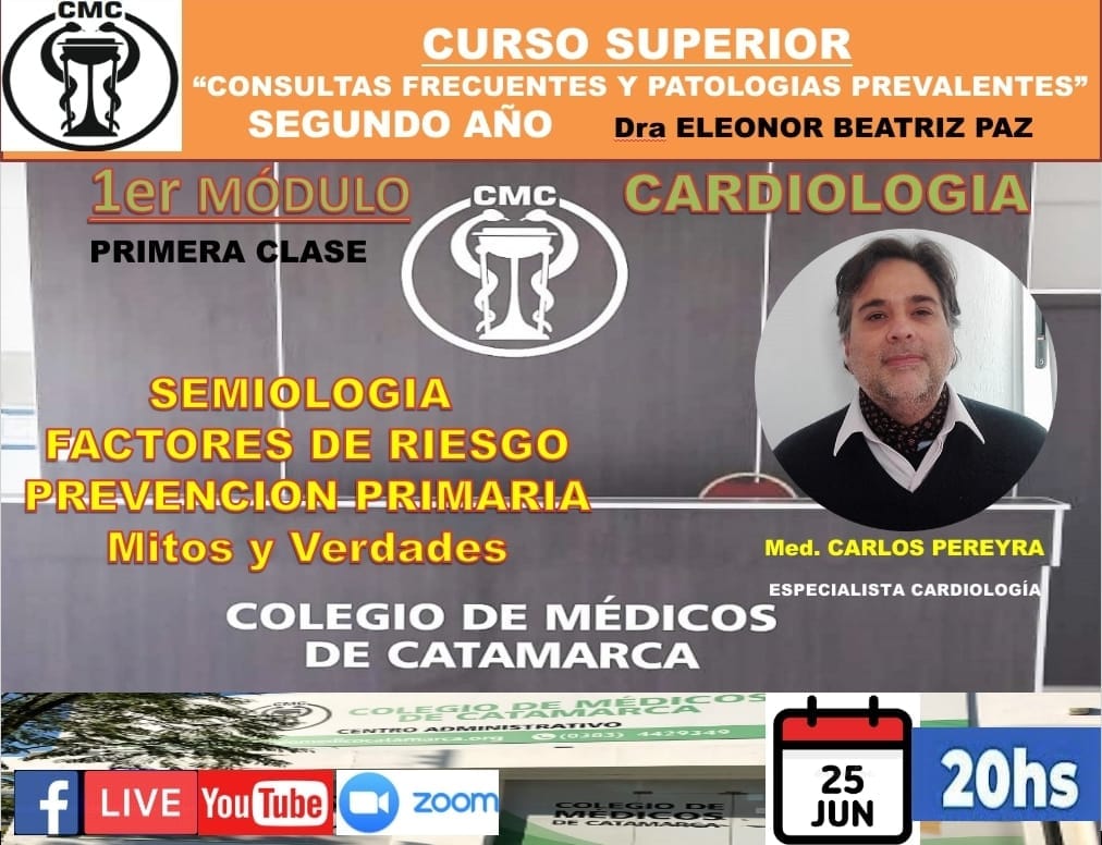Tercera Clase ‘Módulo de Cardiología” , segundo año. Curso Superior de “consultas frecuentes y patología prevalente” del Colegio de Médicos de Catamarca. “Dra. Eleonor Beatriz Paz” In memoria.