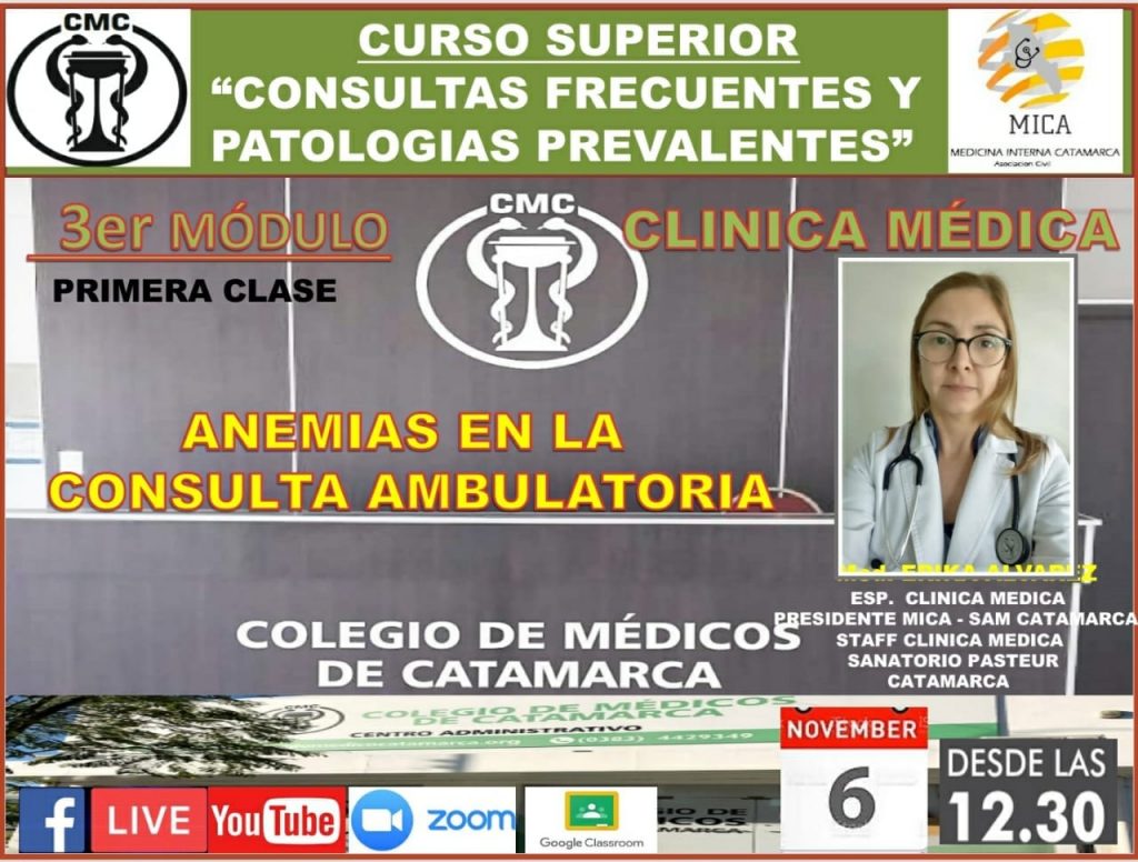 INICIA EL TERCER MÓDULO DEL CURSO SUPERIOR DE PATOLOGÍA PREVALENTE y CONSULTAS FRECUENTES En esta oportunidad INICIAMOS ESTE MÓDULO que correponde a CLÍNICA MÉDICA. El dia viernes 6 DE NOVIEMBRE, te esperamos a las 12 y 30 para la PRIMERA CLASE. El TEMA SERÁ “ANEMIAS”. Disertante Méd. Especialista en Medicina Interna, ERIKA ÁLVAREZ. Presidente de […]
