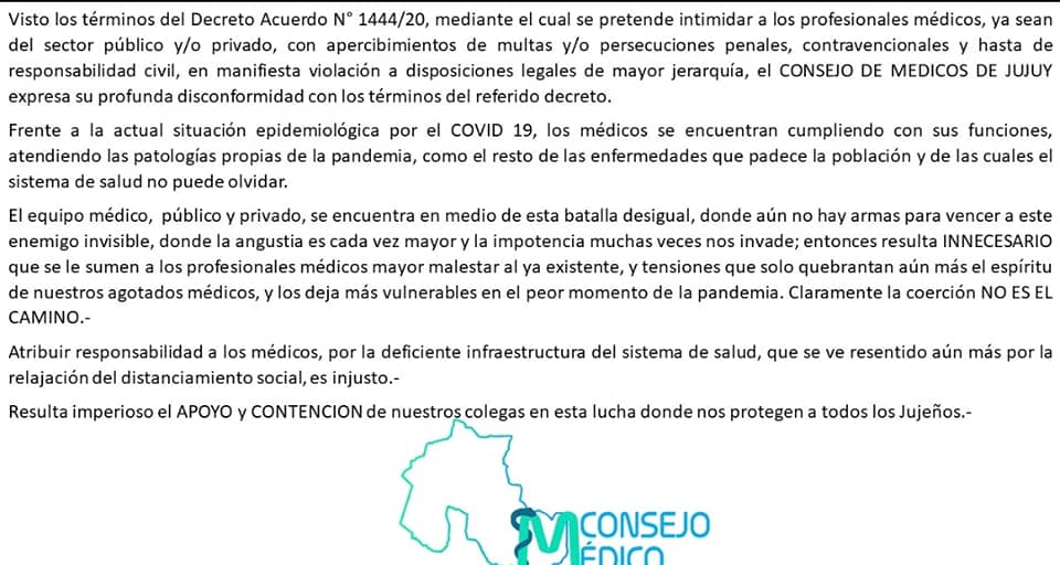 CATAMARCAEl Sr. Presidente del Consejo Federal de Entidades Médicas Colegiadas de Argentina (CONFEMECO), Dr. Mauricio Esquinazy, rubrica el primer documento que compartimos, donde pone en palabras el sentir de la Comunidad Médica Argentina.El segundo documento refleja la DURÍSIMA REALIDAD de nuestros Colegas Terapistas Intensivos, que dan batalla, hasta perder la vida en algunos casos en […]