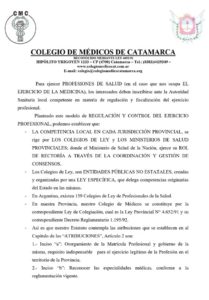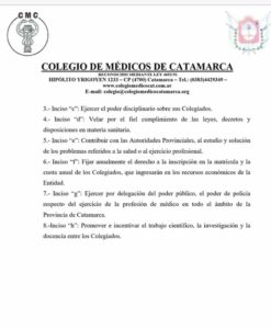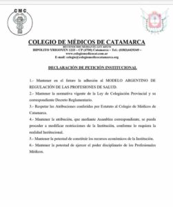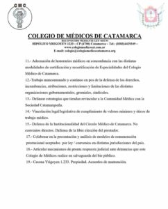 – Expresamos la necesidad de mantener la Institucionalidad en un futuro de ambas Entidades Colegio Médico y Círculo Médico de Catamarca. Con las atribuciones de ejercer el control de ejercicio profesional y de especialidades, el ejercicio del control disciplinario de sus Colegiados; y las facultades de conveniar con obras sociales respectivamente.